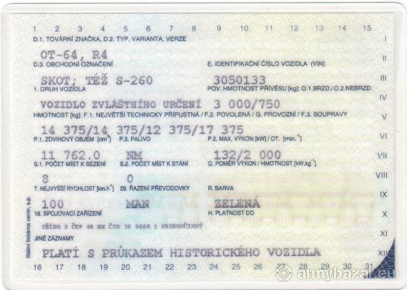 Popis: OT 64 SKOT verze R4, funkční s přidělenou historickou SPZ. Má sjednané povinné ručení a povolení provozu na pozemních komunikacích.